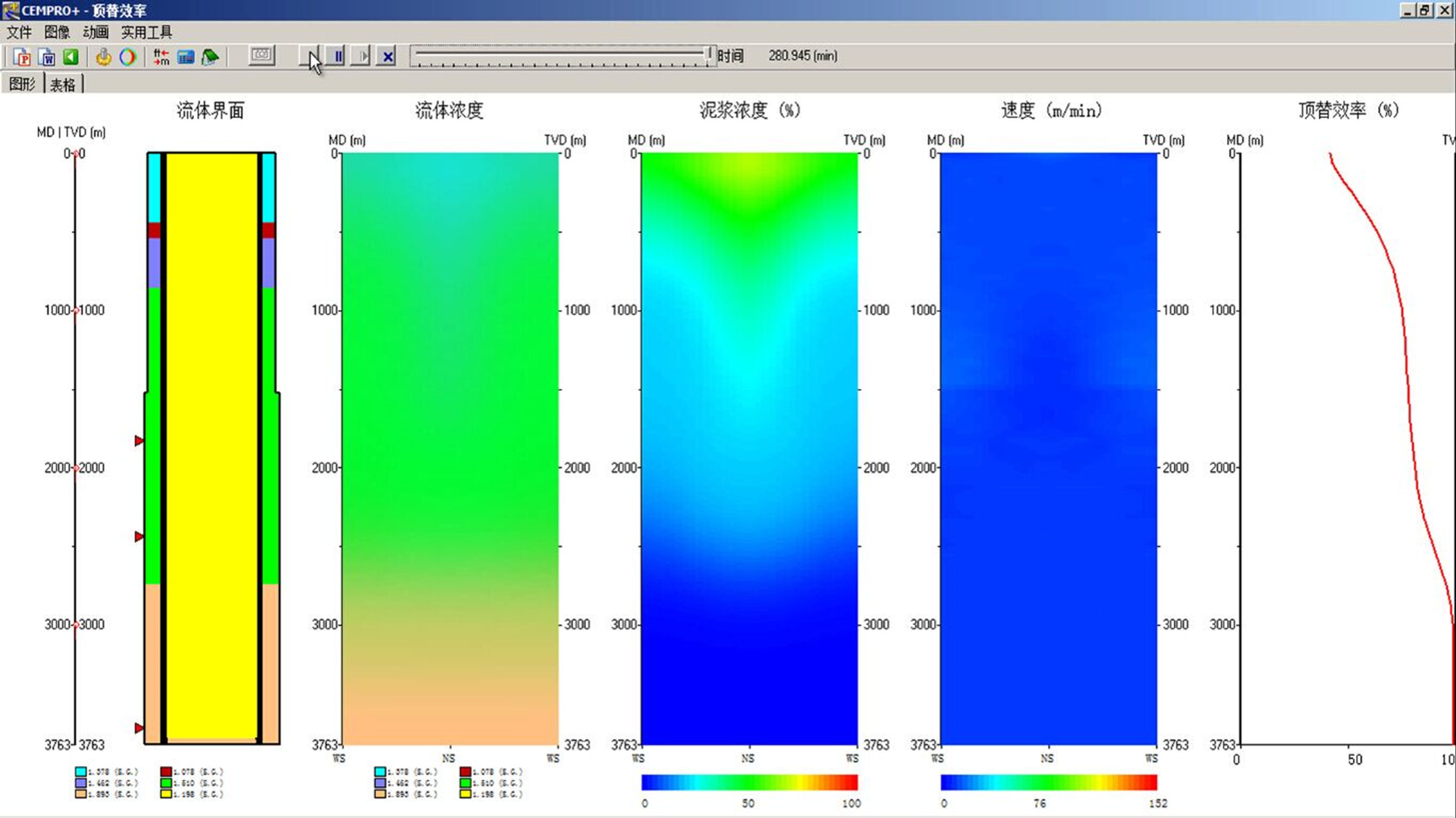 Cementing process can be dynamically simulated, showing the flow pattern, pressure profile, pump pressure and other parameters.