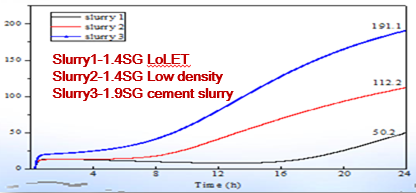 Because the light weight agent provides elasticity with same magnitude of thermal expansion, so the cement sheath will survive the downhole thermal shock of production cycles. The applicable placement temperature range is 86℉ -194℉ and the maximum production temperature is 662℉. Therefore, it is applicable for SAGD, CSS and other thermal recovery applications.