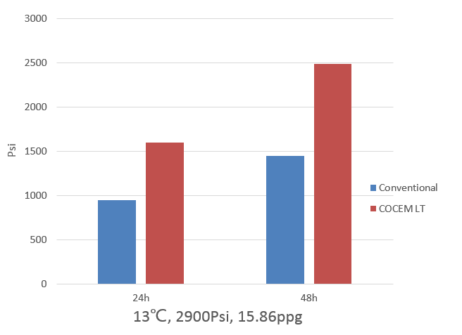 The COCEM-LT low temperature cement system is the upgrade of COCEM-LoLET cement system. It presents better gas migration control property and rapid compressive strength development.