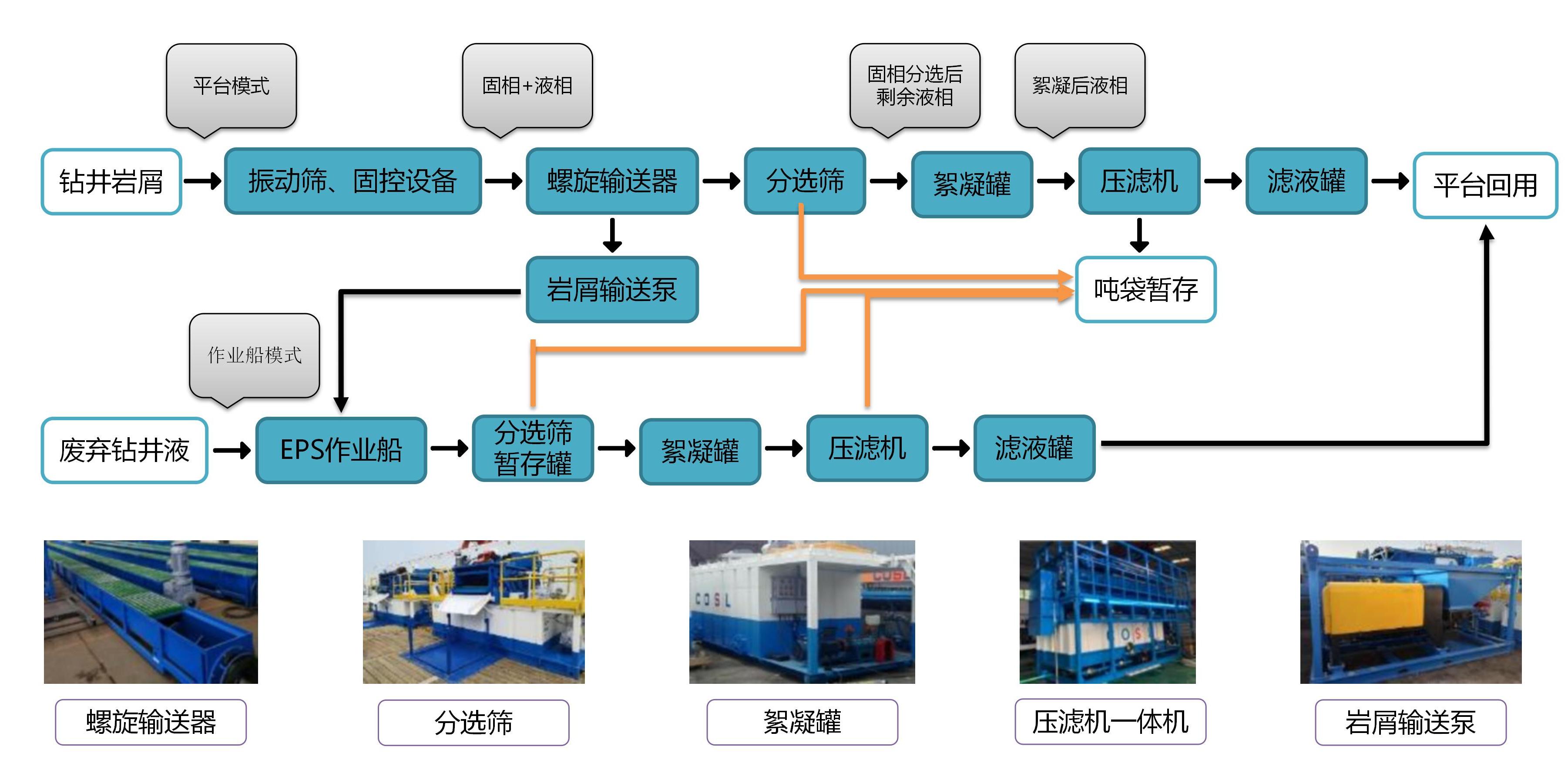 Aiming to the requirement of water-based drilling fluid & cuttings reduction treatment, the Oilfield Chemicals Division of COSL has developed an environment-friendly drilling fluid system BIODRILL A, water-based drilling fluid & cuttings reduction and recycling technology and solid resource recycling technology, forming a "Product- Waste-Product” whole life cycle resource recycling technology system. Upon on this syetem, we provide platform reduction treatment, Environmental Protection Solution Vessle (EPSV) reduction treatment, onshore mud plant reduction treatment and recycling etc. Our technologies meet the operational necessary of both offshore and onshore oilfields.