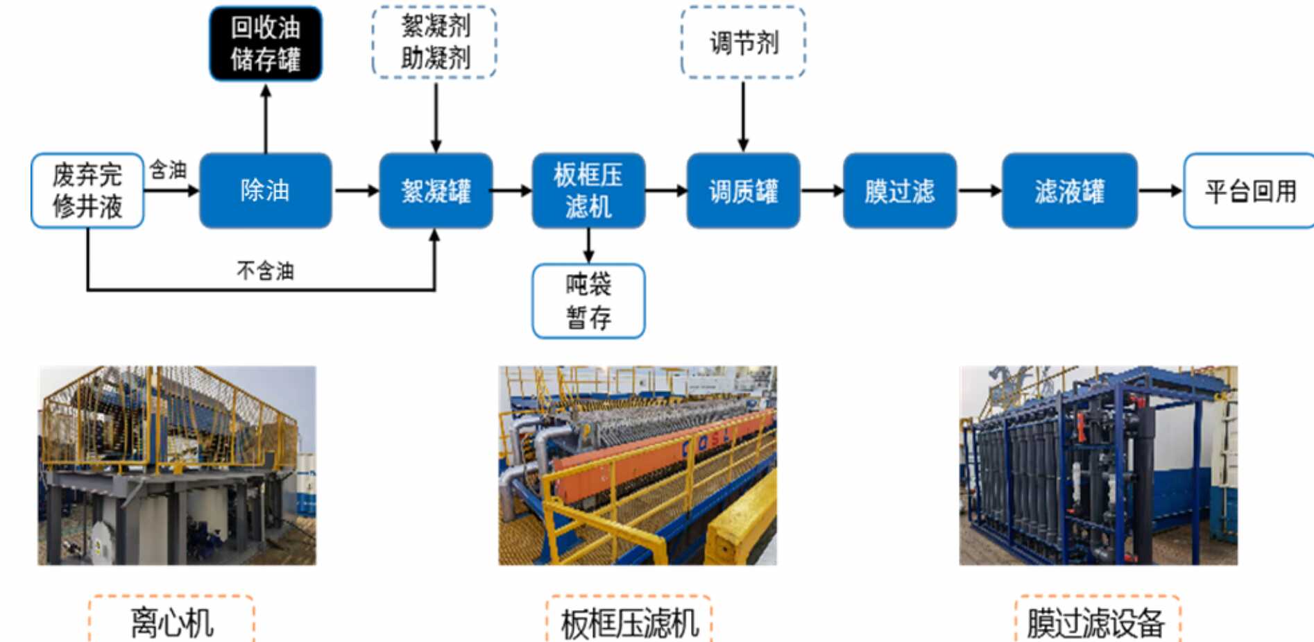 For the environmental friendly treatment of well completion waste, we provide the integrated well completion and workover waste treatment technology of "oil removal + viscosity reduction and destabilization + solid-liquid separation + reuse", and its technical capabilities can cover operations in offshore oilfields and onshore oilfields need.