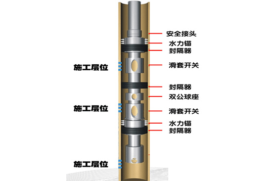 If multiple layers within the same wellbore need fracturing at the same time, while the fracture pressure of the target layer varies greatly, it is required to run a string and adopt multi-stage packer setting to separate the target layers, and then complete multiple fracturing tasks at one time. This technology is targeted, effective with high reliability, and could control the injection rate of each stage and each layer accurately, which is applicable to the layered operations with a certain distance between perforated layer/section. At present, the technology has been widely used in land oilfields, with an obvious stimulation effect after fracturing.