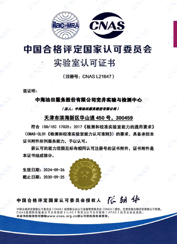The inspection and testing of the safety valve, isolation packer, bridge plug, completion accessories, and metal materials have obtained accreditation certificates from the China National Accreditation Service for Conformity Assessment (CNAS). It is a milestone marking the experimental platform's formal entry into the ranks of nationally recognized standard laboratories and its hardware capabilities, management levels, and technical abilities for precise testing and experimentation being in line with international standards.