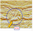 双方位成像结果根据不同地质要求,物探研究院会选择不同的偏移方法,对比各种方法的结果,选择最合适的流程。Beam 射线束深度偏移能够处理多路径参数成像结果具有更高的信噪比。RTM 基于双程波动方程,绕射波和回转波能够更好地成像。
