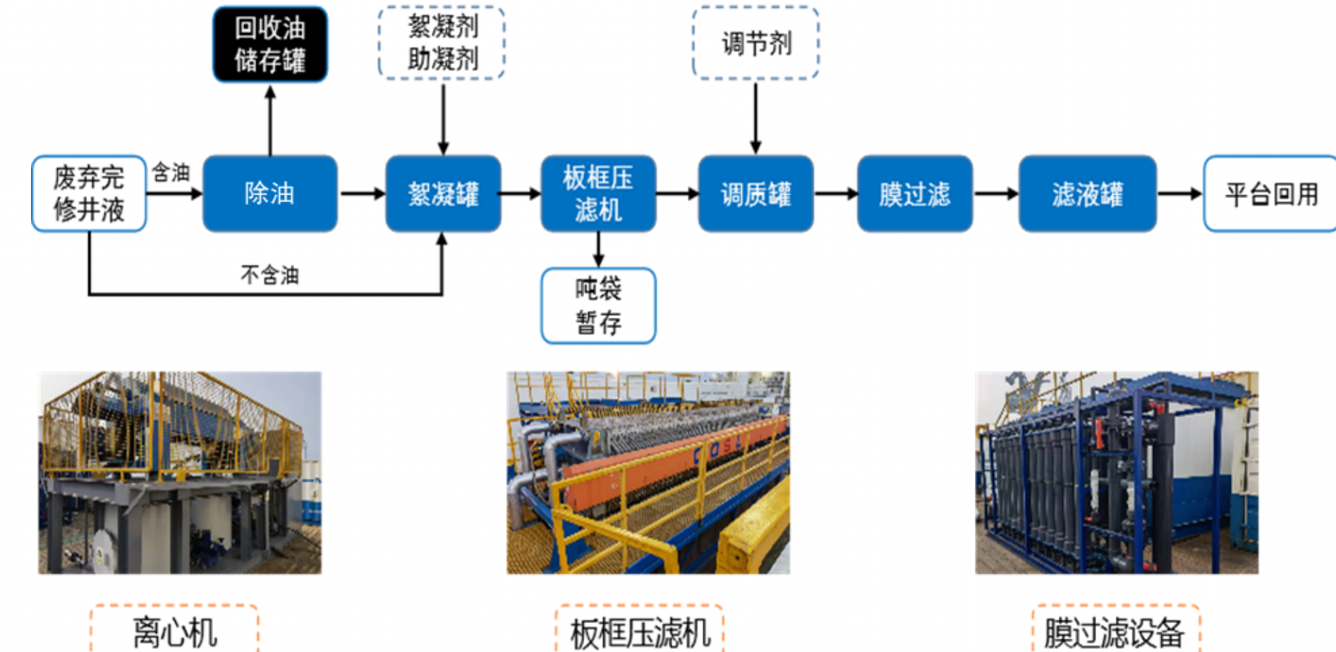 针对完修井废弃物的环保处理,提供“除油+降粘脱稳+固液分离+回用”一体化废弃完修井液处理技术,技术能力可覆盖海上油田及陆地油田的作业需求。
